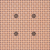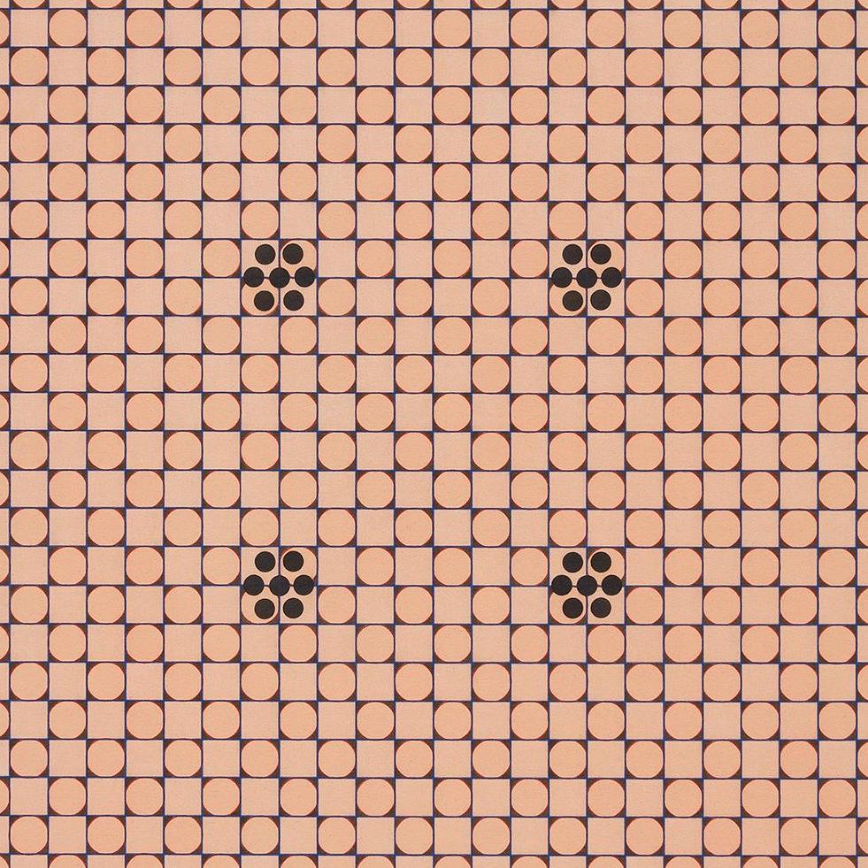 A symmetrical image of windowless houses rendered in inverted colors with tones of purple, yellow, and pink.