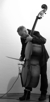 • A performer is surrounded by equipment, playing on stage. The stage is bathed in green and blue light patterns created by a projection.