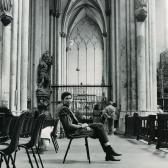 Image description A figure performs on stage, standing straight and looking at material held on a music stand in front of them.